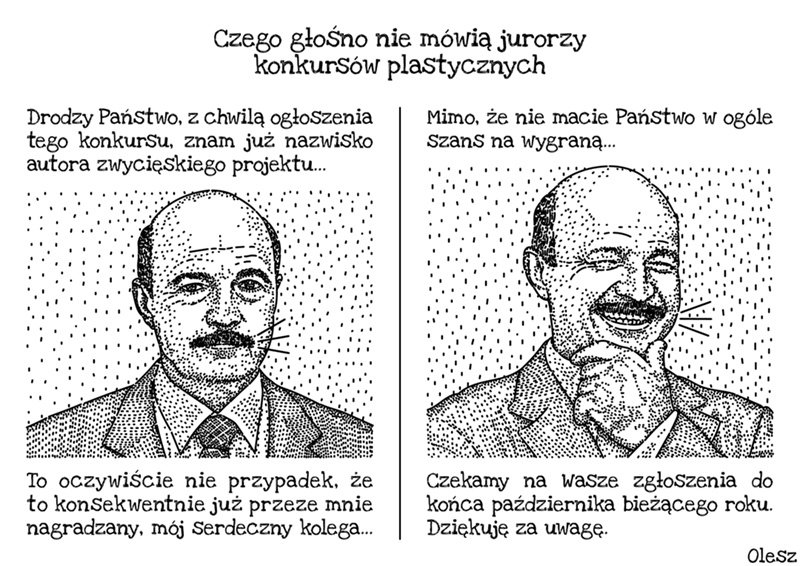 Często zestawiając nazwiska zwycięzców konkursów plastycznych z nazwiskami jurorów, dostrzegamy łańcuchy wzajemnych powiązań. Organizator konkursu zapraszając wybranych specjalistów w danej dziedzinie do sędziowskiego składu jury, najczęściej liczy zapewne na profesjonalną, obiektywną i uczciwą ocenę nadesłanych projektów, a tu po raz kolejny na szkodę dla renomy powtarzających się często cyklicznie konkursów wkrada się prywata, a za nią nieuczciwe nagradzanie „swoich ludzi”. Jest to bardzo przykre i zarazem krzywdzące dla innych uczestników, którzy biorąc uczciwy udział w konkursach, nie mając świadomości tego typu praktyk, często podobnie jak sami organizatorzy. Na przestrzeni lat podczas ponownego sędziowania w konkursach, nieuczciwi jurorzy wykorzystując swoją uprzywilejowaną pozycję, budowali kariery „swoich ludzi”, ubarwiając je kolejnymi sukcesami. Stosując system ”raz ja nagrodzę Ciebie, innym razem Ty mnie” wzajemnie po przyjacielsku ubarwiali swoje życiorysy.