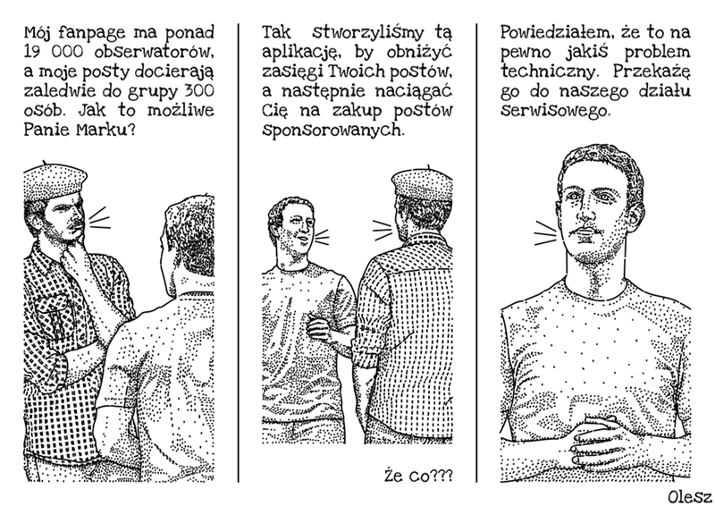 Wielu artystów prowadząc fanpage na Facebooku premierowo dzieli się ze światem swoją twórczością. Wielu z nich przez lata udało się zebrać naprawdę pokaźną grupę obserwatorów. Publikując nowe posty to chyba naturalne, że liczą, że jak najwięcej osób z grupy ich obserwatorów wejdzie w interakcje z ich nowym postem zostawiając reakcję, komentarz lub też udostępnienie. Tymczasem okazuje się, że nowy post zamiast zostać wyświetlony wszystkim obserwatorom danego fanpage’a dociera zaledwie do bardzo małej grupy odbiorców. Twórcy zrezygnowani wynikami oglądalności i marnej interakcji, mający świadomość, ile pracy włożyli w stworzenie danego projektu często w końcu naginają się praktykom Facebooka i decydują się na wymuszoną opcję poszerzenia zasięgu swego posta za pomocą postu sponsorowanego, finansując coraz to większą zachłanność portalu, który świadomie tnie zasięgi postów, by następnie naciągać twórców na swoją płatną usługę.