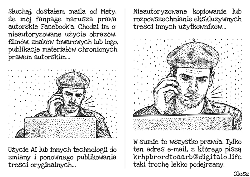 Od dłuższego już czasu mój facebook’owy fanpage „Co z tą Sztuką?” oraz komunikator Messenger zasypywane są wiadomościami e-mail od oszustów podszywających się pod amerykański konglomerat technologiczny Meta (zarządzający między innymi portalem Facebook). W swoich wiadomościach informują mnie między innymi o tym, że treści przeze mnie publikowane naruszają prawa autorskie, nawołując do weryfikacji tych oskarżeń poprzez kliknięcie odpowiedniego profesjonalnie utworzonego przycisku, który zapewne zhakowałby moje konto i wykorzystał je w nieznanych mi bardziej szczegółowo niecnych celach. Wiadomości wysyłane przez oszustów są na pierwszy rzut oka zazwyczaj naprawdę profesjonalnie sfabrykowane. Treści wiadomości są poprawne stylistycznie, bez podejrzanych błędów językowych, literówek itp. gaf. W skrzynce e-mail nadawca wiadomości wyświetlany jest skrótowo, w stylu: „Meta Support Business”, „Departament Zgodności Meta”, „Meta Ads Team”. Dopiero po rozwinięciu szczegółów adresata wiadomości ukazuje się dziwny pełny adres e-mailowy, z którego została wysłana wiadomość, nie pozostawiający złudzeń, że na pewno nie wysłał go zespół Mety. Zawsze bądźcie czujni co klikacie w internecie.