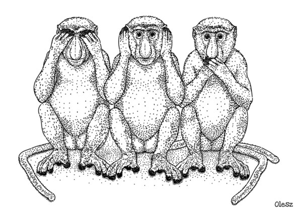 Rysunek nawiązuje do rzeźb z sanktuarium Toshogu w Japonii, które obrazują stare japońskie przysłowie „nie widzę nic złego, nie słyszę nic złego, nie mówię nic złego”. Interpretacja tego przysłowia z buddyjskiego punktu widzenia mówi, by nie szukać i nie wytykać błędnych czynów i słów innych ludzi, a wyplenianie zła zacząć od siebie. W kulturze zachodniej zaś takiego typu przedstawienie jest czasem przewrotnie interpretowane jako ciche przyzwolenie na zło przez odwracanie od niego oczu, a wręcz symbol zmowy milczenia w organizacjach przestępczych. Rzeźby trzech małp znane z pierwowzoru, na potrzeby rysunku zastąpione zostały nosaczami sundajskimi bardzo dobrze znanymi szerszej publice z internetowych memów, gdzie stanowią jedno z wyobrażeń typowego „polskiego Janusza”, czyli osoby przejawiającej stereotypowe negatywne cechy wszystkich Polaków zebrane w jednej pigułce. Czy drobna zmiana, bądź mały krok może doprowadzić nas do lepszego życia? Czy na zmianę perspektywy z jaką podchodzimy do życia nigdy nie jest za późno?