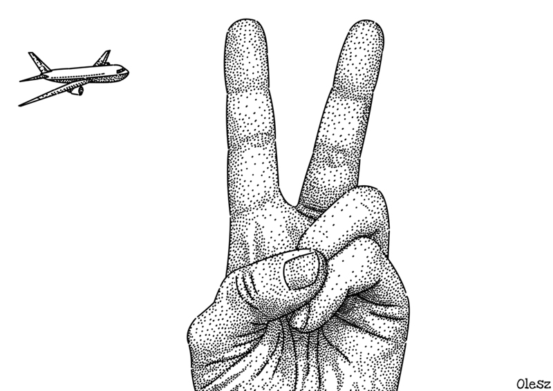 11. września 2001 roku dokonano serii ataków terrorystycznych na terytorium Stanów Zjednoczonych za pomocą uprowadzonych samolotów. Ataki skierowane były na znane obiekty na terenie USA, między innymi na wieże World Trade Center (Światowe Centrum Handlu). Oficjalnie przyjmuje się, iż wieże uległy zawaleniu poprzez naruszenie stalowej konstrukcji nośnej budynków w wyniku uderzenia samolotów, a następnie na skutek intensywnych pożarów zainicjowanych przez eksplodujące paliwo lotnicze. Ostatecznie w zamachu zginęło około 3000 osób. Winą za zamachy obarczono organizację al – Kaida dowodzoną przez Osamę bin Ladena, który w 2004 roku za pośrednictwem arabskiej telewizji satelitarnej Al – Dżazira oficjalnie wziął na siebie odpowiedzialność za zamachy i zagroził ich powtórzeniem. Rysunek nawiązując do wydarzeń z 11 września 2001 roku podejmuje problem terroryzmu, który w istotny sposób zagraża pokojowi na świecie. Pokój na rysunku symbolizowany jest przez charakterystyczny gest dłoni, spopularyzowany podczas II wojny światowej przez brytyjskiego premiera Winston’a Churchill’a używany następnie między innymi w protestach przeciwko wojnie w Wietnamie oraz przez kontrkulturę hipisów jako znak pokoju.