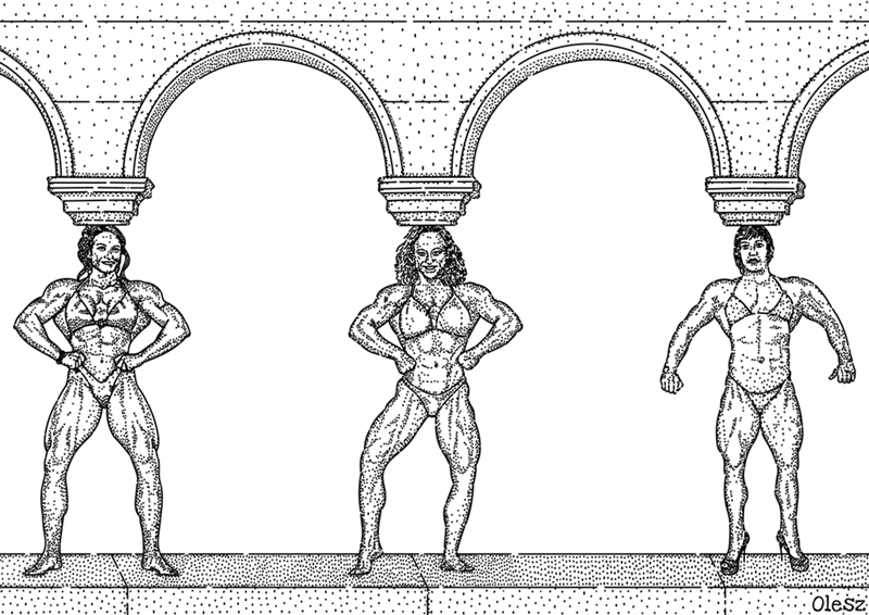 Klasyczne postaci kobiece, dźwigające na głowie elementy architektoniczne budowli, takie jak gzyms, balkon lub nadwieszoną kondygnację budynku, spełniające funkcję kolumny, na potrzeby rysunku zastąpione zostały „mocno wyrzeźbionymi” posągami kulturystek, które wyglądają jakby były gotowe zrobić serię przysiadów z całą świątynią na głowie :).