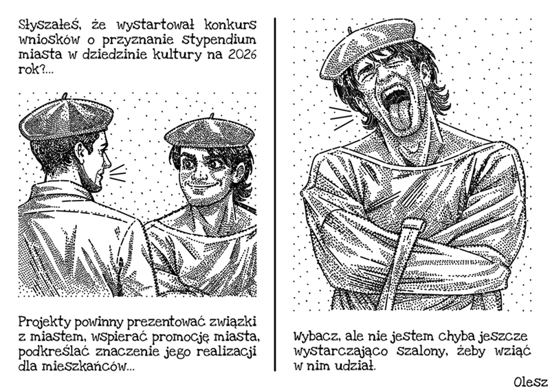 Od lat jako mieszkaniec Torunia śledzę konkurs o stypendium Miasta w dziedzinie kultury przyznawane przez Prezydenta Miasta. Konkursowe projekty mogą dotyczyć między innymi takich dziedzin kultury jak literatura, sztuki wizualne, muzyka, taniec, teatr, film lub twórczość ludowa. Niezmiennie ogarnia mnie zdumienie i złość, gdy widzę kopiowaną co roku adnotację, że projekt konkursowy powinien „prezentować związki z Toruniem, wspierać promocję miasta i podkreślać znaczenie jego realizacji dla mieszkańców”. Dla mnie jako grafika / rysownika jest niewyobrażalną rzeczą, żeby miasto zamiast docenić twórczość lokalnych twórców tworzących unikatowe, oryginalne koncepcje artystyczne zmusza twórców do usilnego naginania swojej twórczości, tylko po to żeby na siłę podkreślić związek projektów z miastem. Co o tym wszystkim sądzicie? Czy w innych miastach sytuacja wygląda podobnie?