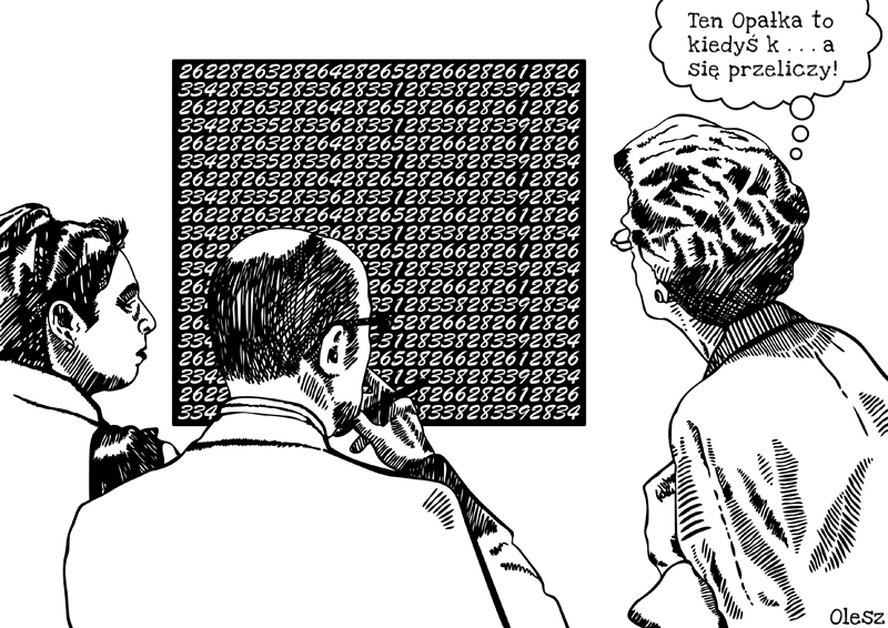 Temat rysunku stanowi najsłynniejszy cykl polskiego malarza, grafika Romana Opałki „1965/1-nieskończoność”. Artysta białą farbą zapisywał na płótnie szeregi liczb. Robił to początkowo na czarnym płótnie, które zmienił następnie na szare, a od 1972 roku stopniowo je rozjaśniał. Wymawiał każdą z liczb, rejestrując cały proces na taśmie magnetofonowej. Do skończonego obrazu dodawał swoje aktualne zdjęcie. Cykl obrazów wraz z serią fotografii jest już aktualnie dziełem zamkniętym z powodu śmierci artysty 6 sierpnia 2011 roku.