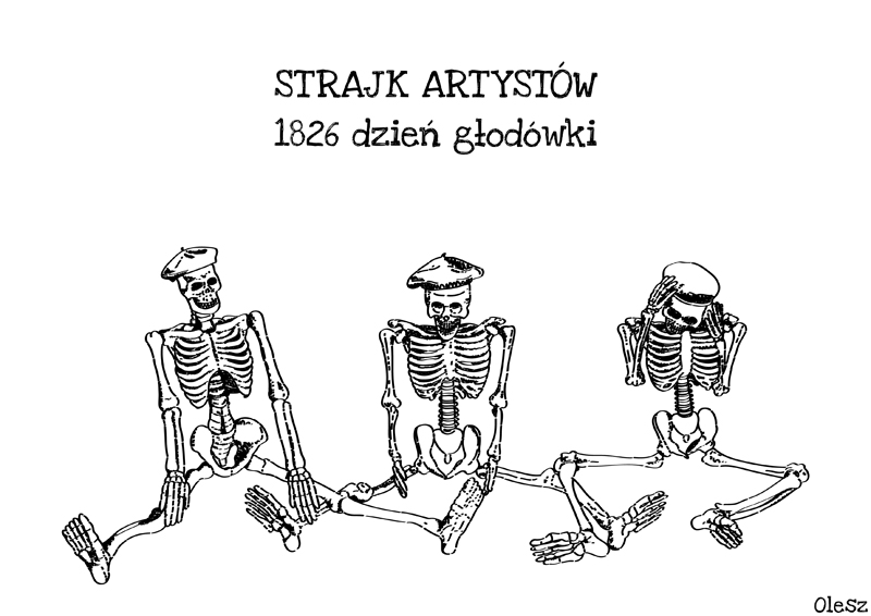 Z końcem października zakończył się strajk głodowy medyków zapoczątkowany protestem rezydentów. W dalszym ciągu nie zakończyli oni jednak walki o idee i swoje sztandarowe postulaty. W Polsce wcześniej przerabialiśmy już między innymi szeroko komentowany strajk głodowy pielęgniarek, górników chcących wymusić ustępstwa oraz wymóc na władzach państwowych korzystne dla siebie decyzje. Jak widać taka forma protestu mimo ryzyka wyczerpania organizmu, a w skrajnych przypadkach nawet głodowej śmierci, dostrzeżona przez prasę, radio i telewizję może okazać się skuteczną formą ubiegania się o swoje racje. Czy każda grupa zawodowa może liczyć jednak na poważne traktowanie w przypadku podjęcia takiej formy strajku? W lipcu tego roku w Toruniu miał miejsce osamotniony 8 dniowy strajk głodowy artysty Arka Pasożyta z Grupy nad Wisłą. Nie przyniósł on jednak oczekiwanego przez artystę, jak i całą grupę artystyczną rezultatu. Ze względu na niewystarczającą medialność całej akcji został on zignorowany przez toruńskich urzędników, którzy jak okazało się w późniejszym komentarzu nie mają zastrzeżeń co do funkcjonowania toruńskich instytucji kulturalnych. Artysta w przeciwieństwie do przedstawionego przeze mnie rysunku na szczęście przeżył cały protest, mimo interwencji pogotowia ratunkowego ostatniego dnia strajku. Czy pomiędzy politykami, urzędnikami a społeczeństwem nie może działać sprawnie funkcjonująca platforma dialogu, by nikt nie był więcej zmuszony uciekać się do szantażu emocjonalnego w tak skrajnej formie, w celu wywalczenia określonych postulatów?