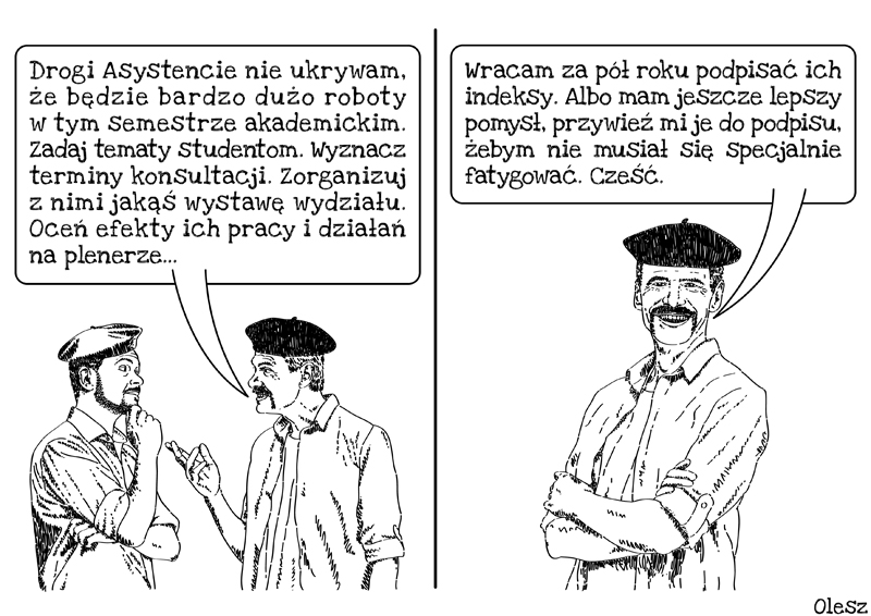 W bardzo licznych przypadkach na wyższych uczelniach artystycznych asystenci sprawują pieczę nad pracowniami pod permanentną nieobecność Profesorów. W końcu, żeby objąć po nich stanowiska w bardzo dalekiej perspektywie, pomijając etap doktoratu, habilitacji, itp. trzeba odpowiednio wkupić się w ich łaski i przez lata broń Boże im nie podpaść. Czy gdyby Profesorzy rzetelniej wykonywali swoją pracę potrzebny byłby w ogóle dodatkowy etat dla ich asystentek/asystentów? Czy obowiązki Profesorów są w rzeczywistości aż tak przytłaczające, że muszą posiłkować się dodatkowym stanowiskiem? Może gdyby należycie zajęli się swoimi podstawowymi obowiązkami na państwowym etacie, a nie chałturzyli na prywatnych uczelniach o profilach lub kierunkach artystycznych, mieliby znacznie więcej czasu na edukację artystyczną studentów, za którą w końcu również biorą pieniądze.