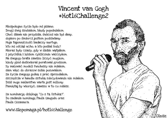 „Hot16Challenge” to ogólnopolska akcja muzyczna zainicjowana przez rapera Karola „Solara” Poziemskiego w 2014 r., która została reaktywowana w kwietniu bieżącego roku w celu wsparcia służb walczących z koronawirusem. Idea wyzwania polega na nagraniu w ciągu 72 godzin od otrzymania nominacji 16 wersowej zwrotki pod dowolny beat. Akcja bije rekordy popularności. Włączyli się w nią zarówno aktorzy, muzycy reprezentujący różne nurty muzyczne, politycy, youtuberzy jak również celebryci prezentując w sieci z różnym rezultatem swoje artystyczne poczynania. Na koncie zbiórki aktualnie zebrano już ponad 3 miliony złotych, a suma cały czas rośnie. Zainteresowanych wsparciem inicjatywy serdecznie zapraszam pod adres: