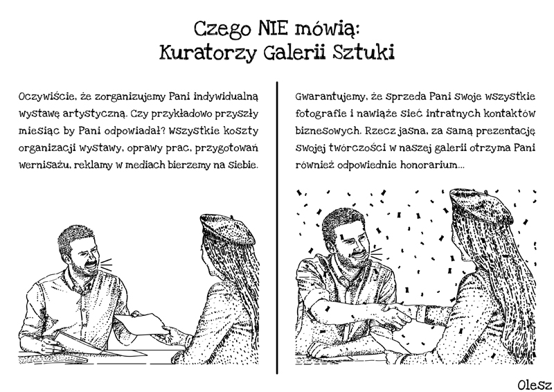 Nie posiadając odpowiednich znajomości, nie będąc pracownikiem wyższej uczelni artystycznej (grupy wyjątkowo uprzywilejowanej w kwestii organizacji wystaw), zawiedziony powszechną sytuacją, z biegiem lat również przestałem zabiegać o prezentację swojej twórczości w galeriach sztuki, placówkach kulturalnych. Skupiłem się na publikacji swoich artystycznych dokonać w sieci za pośrednictwem mediów społecznościowych i myślę, że dzięki tej decyzji zaoszczędziłem sobie wielu kolejnych rozczarowań. Uważam, że w ogólnym rozrachunku internet daje mi o wiele większe możliwości dotarcia ze swoim przekazem do odbiorców niż ograniczona metrażem i lokalizacją galeria sztuki, która skupia określoną lokalną społeczność. Galerie sztuki poza udostępnieniem przestrzeni wystawienniczej, za którą również w licznych przypadkach trzeba zapłacić, rzadko dają coś więcej od siebie. Koszty oprawy prac, organizacji wernisażu (zakup wina oraz napojów bezalkoholowych, przekąsek itp.) leżą w większości przypadków po stronie samego artysty. Galerie nie dają gwarancji, że Twoją twórczość zobaczy szersze grono osób, poza pracownikami galerii, a tym bardziej, że jako twórcy uda Ci się nawiązać intratne kontakty biznesowe i sprzedać jakąkolwiek z prac, która pokryłaby chociaż w jakimś stopniu wygenerowane koszty organizacji takiej wystawy. O dodatkowym honorarium za samą prezentację swojej twórczości w galerii nawet nie ma co marzyć. Czy w rzeczywistości nie powinno to wszystko wyglądać zupełnie inaczej, przynajmniej trochę bardziej podobnie do załączonego rysunku? Osobom spoza kręgów artystycznych często wydaje się, że to wszystko tak właśnie sprawnie funkcjonuje, realia są jednak niestety zupełnie inne.