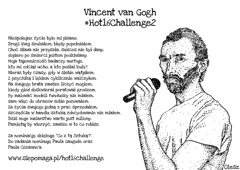 „Hot16Challenge” to ogólnopolska akcja muzyczna zainicjowana przez rapera Karola „Solara” Poziemskiego w 2014 r., która została reaktywowana w kwietniu bieżącego roku w celu wsparcia służb walczących z koronawirusem. Idea wyzwania polega na nagraniu w ciągu 72 godzin od otrzymania nominacji 16 wersowej zwrotki pod dowolny beat. Akcja bije rekordy popularności. Włączyli się w nią zarówno aktorzy, muzycy reprezentujący różne nurty muzyczne, politycy, youtuberzy jak również celebryci prezentując w sieci z różnym rezultatem swoje artystyczne poczynania. Na koncie zbiórki aktualnie zebrano już ponad 3 miliony złotych, a suma cały czas rośnie. Zainteresowanych wsparciem inicjatywy serdecznie zapraszam pod adres: