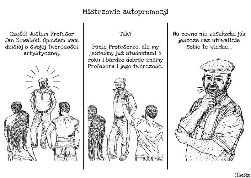 Z pewnością na każdej wyższej uczelni artystycznej znajdą się Profesorzy bezkrytycznie zakochani w swojej twórczości artystycznej, przeświadczeni o swojej wyjątkowości, przez lata poklepywani po plecach przez swoich współpracowników. Nad wyraz chętnie dzielą się oni ze swoimi aktualnymi studentami opowieściami o swoich twórczych dokonaniach, dbając by ich legenda została dobrze utrwalona i zapamiętana przez przyszłe absolwentki/absolwentów.