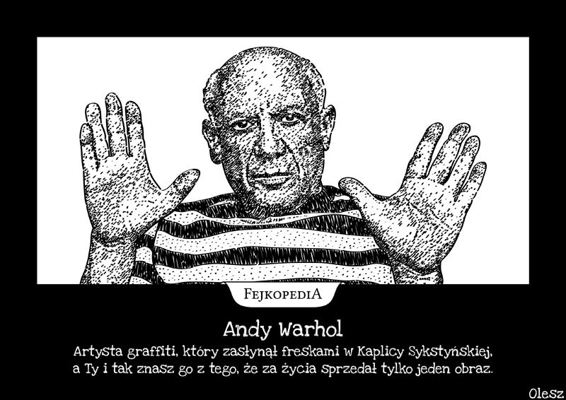 W dobie powszechnie rozpowszechnianych przez media społecznościowe fake newsów, warto wielokrotnie weryfikować prawdziwość pozyskiwanych informacji. Żeby internet w dalszym ciągu pełnił funkcję edukacyjno-informacyjną bez wątpienia przydałoby się solidne oczyszczenie go ze szkodliwego trendu rozpowszechniania w nim fałszywych informacji. Należy jednak rozróżniać nieprawdziwe i wprowadzające w błąd odbiorców fałszywe wiadomości, od satyry lub parodii, które nie mają takiego celu i przeznaczone są do celów humorystycznych. W swojej grafice ironicznie połączyłem życiorys amerykańskiego artysty, jednego z głównych przedstawicieli pop-artu Andy’ego Warhola, brytyjskiego artysty street art Banksy’ego, włoskiego rzeźbiarza, malarza, poety i architekta epoki odrodzenia Michała Anioła oraz holenderskiego malarza postimpresjonisty Vincenta van Gogha. Sam rysunek przedstawia zaś oczywiście hiszpańskiego malarza, rzeźbiarza, grafika, ceramika oraz poetę Pabla Picassa.