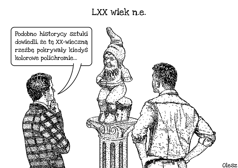 Mój rysunek poza ogrodowymi krasnalami nawiązuje do starożytnych rzeźb kojarzonych z ascetyczną kamienną bielą, którą jak dowiodły badania historyków, w przeszłości pokrywały kolorowe polichromie, które na przestrzeni lat wyblakły lub straciły swój kolor w trakcie czyszczenia z warstw brudu podczas procesów renowacyjnych.