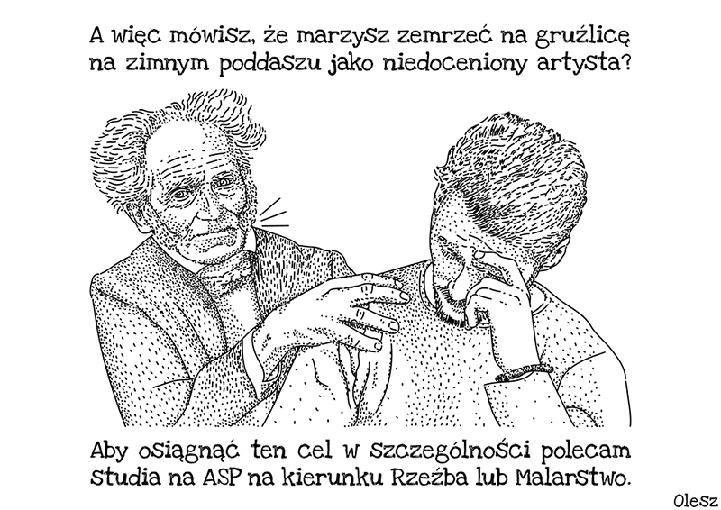 Jedna z postaci przedstawionych na rysunku to niemiecki filozof Arthur Schopenhauer – przedstawiciel pesymizmu w filozofii. Pesymizm jako pogląd filozoficzny charakteryzuje brak wiary w przyszłość, w postęp społeczny, w celowość życia i jego wartości. Jako filozoficzna postawa wobec świata pesymizm pojawił się w szkole cyrenejskiej w V w. p.n.e. jako przeciwieństwo hedonizmu, poglądu uznającego przyjemność i rozkosz za najwyższe dobro, cel życia oraz główny motyw ludzkiego postępowania. Mimo sarkazmu, który zawarłem w swoim rysunku mam nadzieję, że perspektywy absolwentów Rzeźby i Malarstwa w rzeczywistości wyglądają zdecydowanie bardziej optymistycznie ![]()