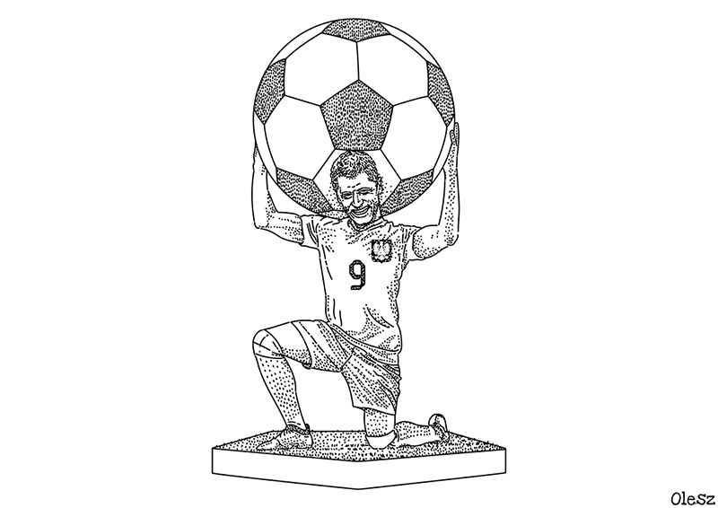 Postać Atlasa w moim rysunku zastępuje piłkarz reprezentacji Polski w piłce nożnej Robert Lewandowski (na co dzień gracz klubu FC Barcelona) na którym mimo, że nie piastuje już stanowiska kapitana, w dalszym ciągu zdaje się spoczywać ciężar walki o udział w piłkarskich mistrzostwa Europy w 2024 r. Chociaż nasza reprezentacja wydawała się głównym faworytem do wyjścia z grupy, została ostatecznie wyprzedzona przez Albanię i Czechy. Dzięki swojej pozycji w Lidze Narodów nie straciła jednak szans na awans na Euro 2024, pod warunkiem wygrania meczy barażowych, których finał poznamy zgodnie z zapowiedziami dopiero 26 marca 2024 roku.