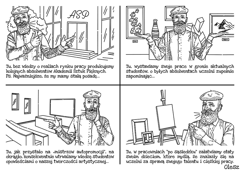 Akademie Sztuk Pięknych rządzą się swoimi prawami. Najlepiej wie ten, kto przekonał się o tym na własnej skórze ;). Rysunek został zainspirowany viralowym filmem „Krótki przewodnik po hotelu” z platformy Tik Tok nakręconym przez hotel Elements Hotel & SPA w Świeradowie-Zdroju, który postawił na humorystyczną promocję swojego obiektu, z przymrużeniem oka, bijąc przy tym rekordy oglądalności w sieci. Filmikiem zainspirowało się wiele innych obiektów z branży hotelarskiej jak i spoza niej, tworząc powszechny trend w social mediach, który postanowiłem w swym rysunku nieco bardziej przewrotnie zinterpretować.